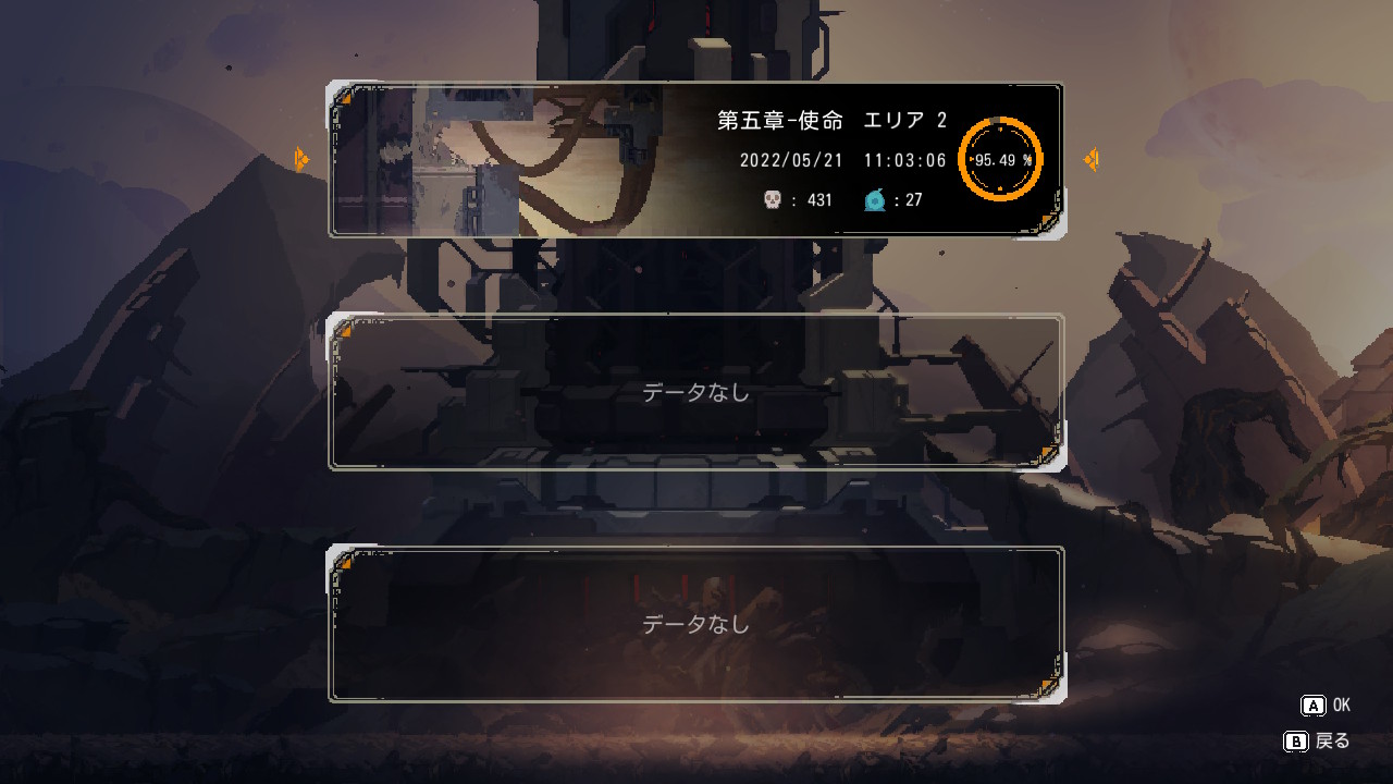 腕に自信がないからイージーでプレイした。他との違いは体力の初期値が多い・自然回復が早い・ギミックの動きが遅くなってる……とかsteamの更新履歴にわかりやすく書いてあった。それでもふつうに難しくて400回以上死にました。